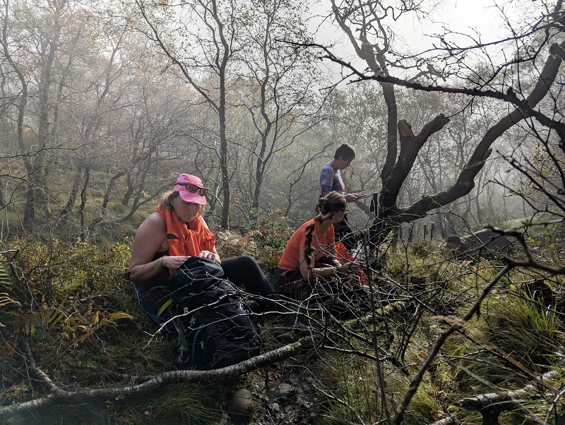 Welcome piece stop in the trees before setting off again to reach Bealach na h-Imriche, and the start of the “steep bit”! Although this hill is not classed as a Munro or Corbett it is a challenging hike with a narrow rocky path near the summit and several boggy sections.