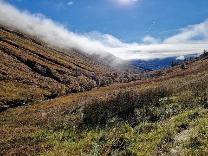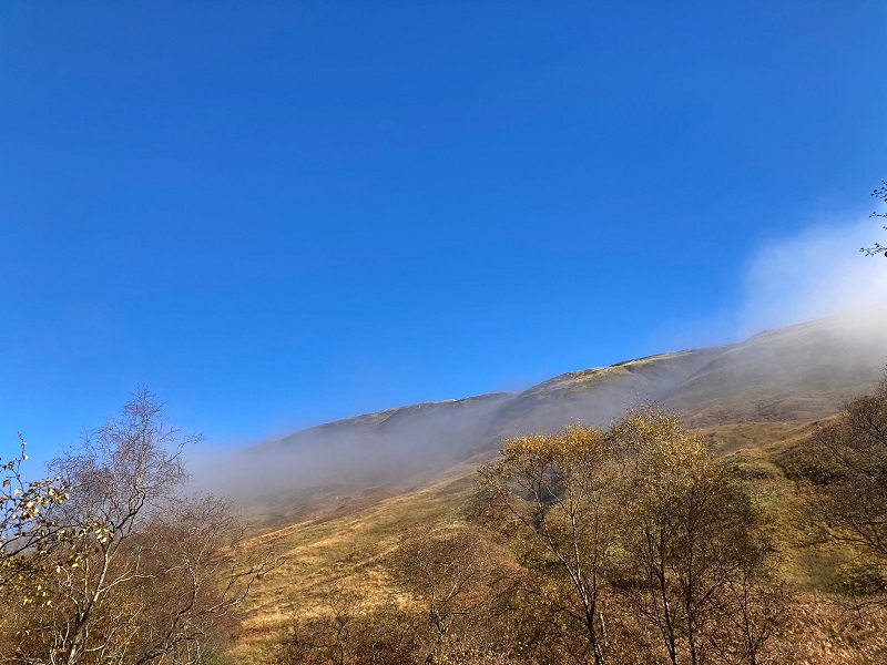 It was early October, season of autumn mists when club members ventured to the Trossachs to climb Ben Venue. Starting from near Ledard farm by Loch Ard an area which Walter Scott brought into his novels Waverley and Rob Roy. Mist low down all the way from Blair but this soon cleared as we made our way in broadleaf woodland by the Ledard burn. Only 14 walkers so we all decided to do the A/B walk.