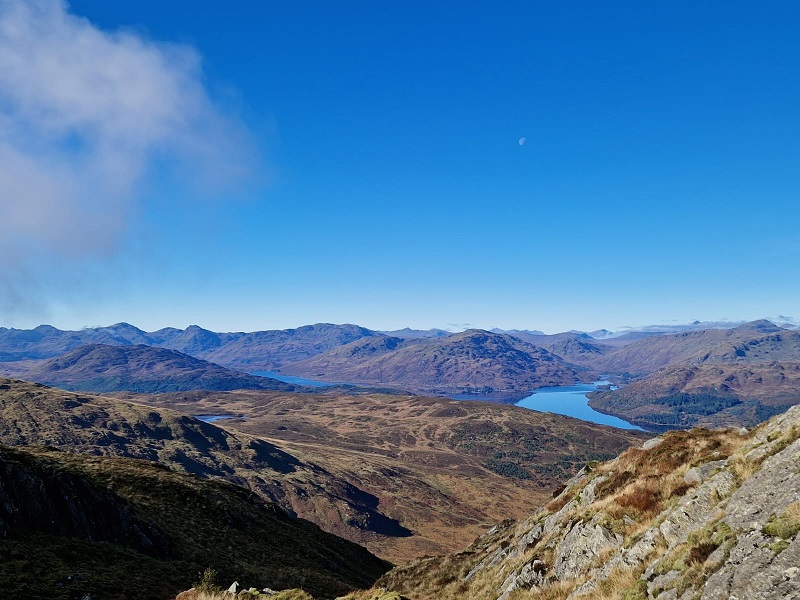 The panorama at the summit rewarded walkers with “calendar shot views” over Loch Katrine and Loch Venacher. Sir Walter Scott again came to mind as we spied a tiny dot, the Lady of the Lake, making her way up Loch Katrine. Lunch on the summit in warm sunshine, enjoying splendid views. Thereafter we retraced steps to the bealach and then branched off southwards into Gleann Riabhach and forests to meet the coach. An excellent example of using coach transport to allow walkers to enjoy a through walk with a variety of scenery