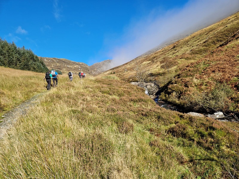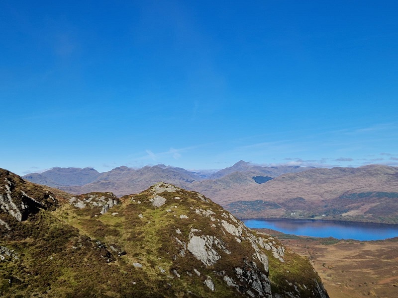 The panorama at the summit rewarded walkers with “calendar shot views” over Loch Katrine and Loch Venacher. Sir Walter Scott again came to mind as we spied a tiny dot, the Lady of the Lake, making her way up Loch Katrine. Lunch on the summit in warm sunshine, enjoying splendid views. Thereafter we retraced steps to the bealach and then branched off southwards into Gleann Riabhach and forests to meet the coach. An excellent example of using coach transport to allow walkers to enjoy a through walk with a variety of scenery